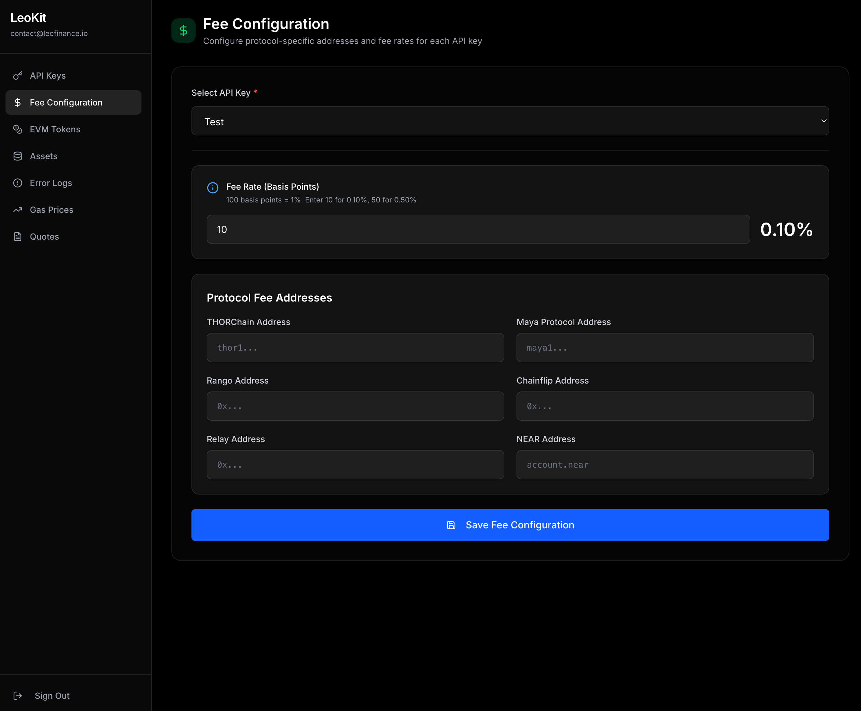https://leokit.dev/assets/fees-screenshot_1767462365419-Do79Bq68.png To earn on your swaps, use LeoKit’s dashboard to:- Set your fee rate (how much you’ll charge your users)